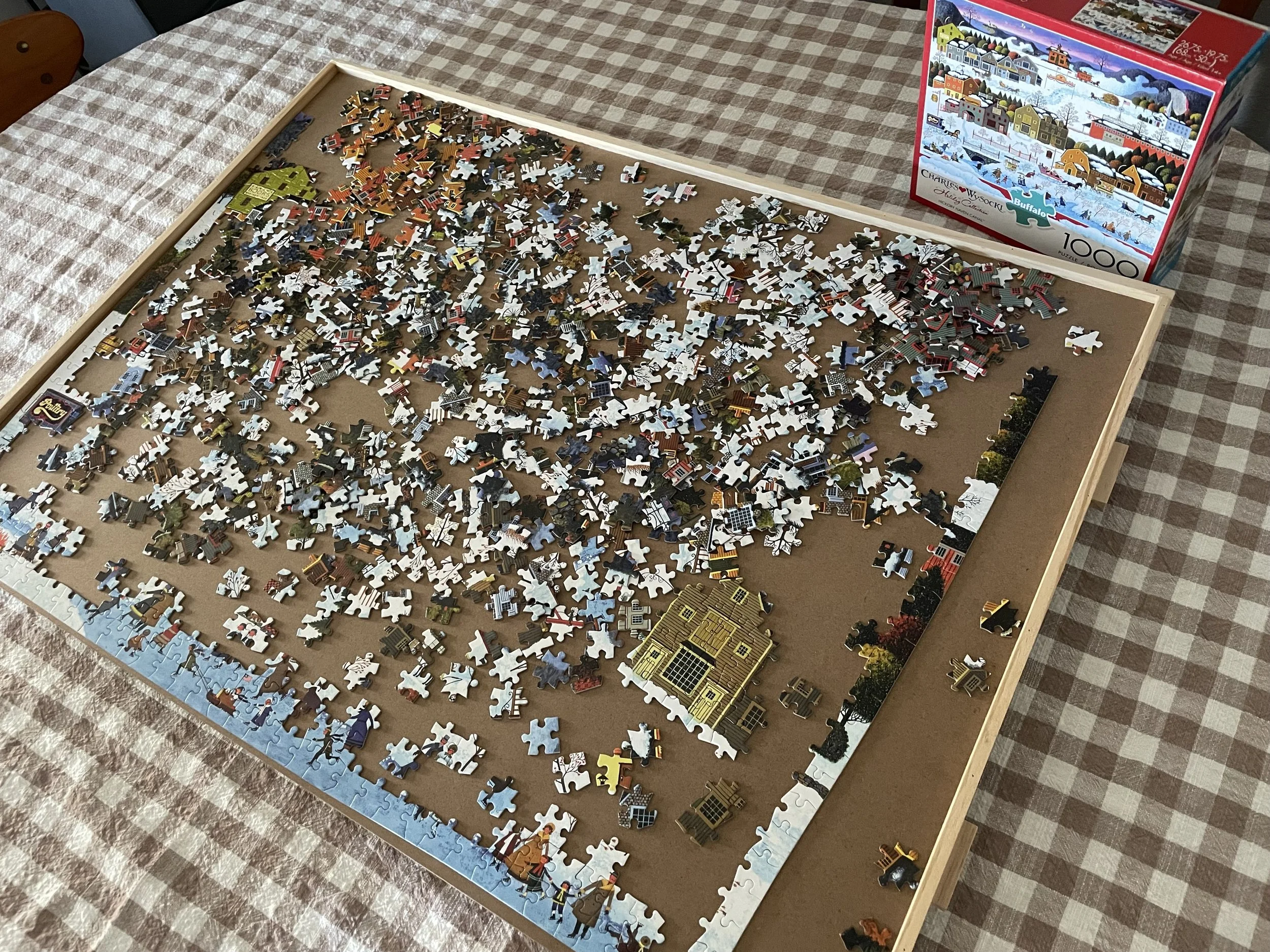 Here’s our puzzle table and the fun winter puzzle we found at Goodwill.