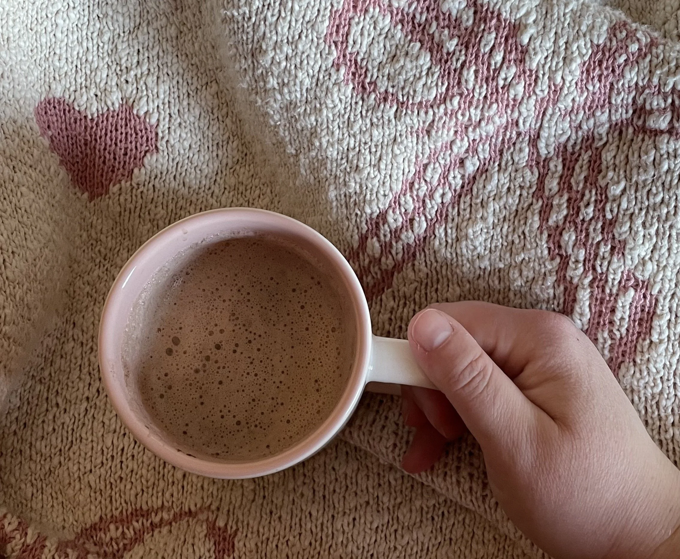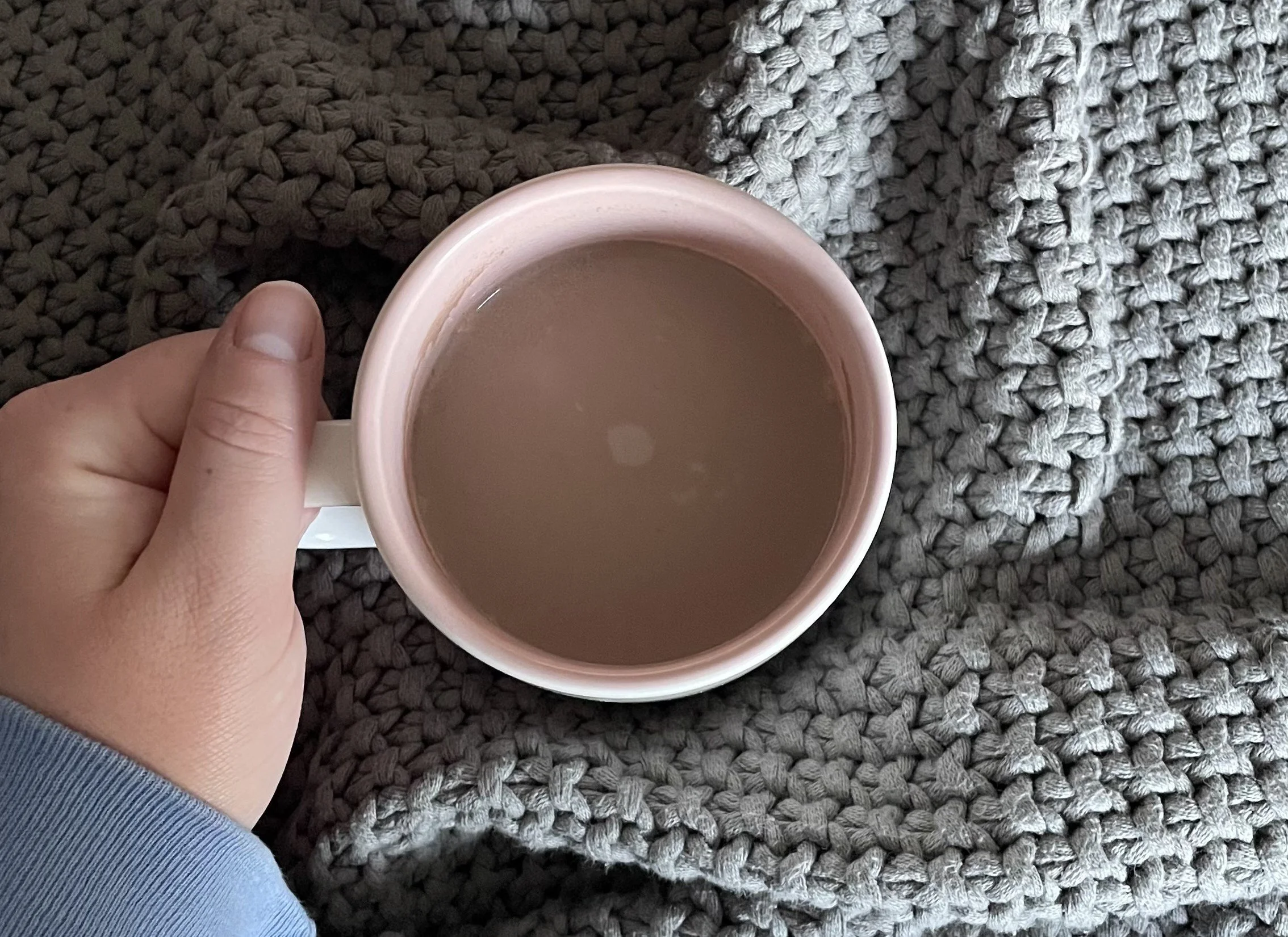 Here’s the cozy TJ Maxx blanket with my morning mocha.