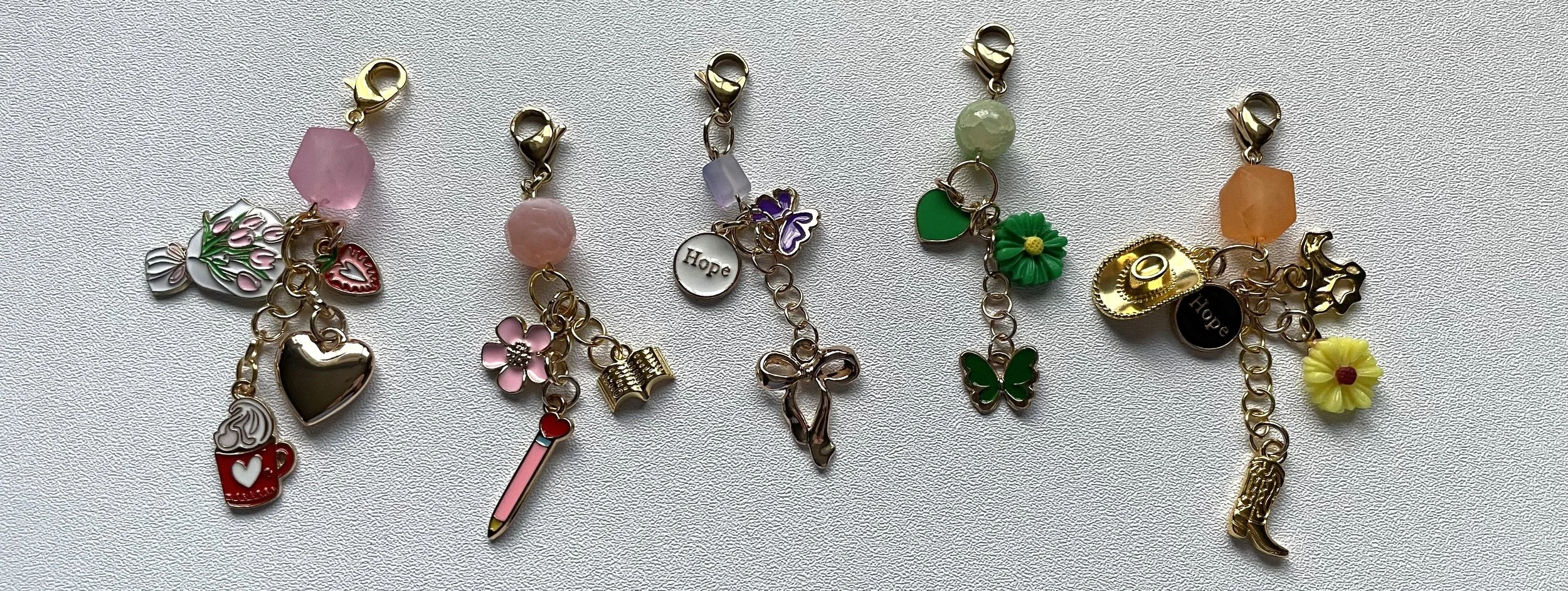 Charms (You can get these from Hobby Lobby, Michaels, and Amazon. I started by purchasing charms from Hobby Lobby and Michaels, but I realized how EXPENSIVE they were. The charms on Amazon come in sets of 50-100. The average person does not need to have 100 heart charms. I had the idea to make DIY charm kits for my Etsy shop. These kits come with 17 different styles of charms and 2 lobster claw clasps for you to make your own journal charms. You can click here to check out the DIY journal charm kits in my Etsy shop. They come with 3 Valentine’s/love themed charms, 3 butterflies, 2 bows, 1 cowboy themed charm, 1 book/Bible, 1 white heart, 1 colored hope, 1 tea kettle, 1 teacup, 1 cross, 2 flowers. I like to use 3-5 charms on each journal charm bundle I make, so this set in my Etsy shop gives you plenty of charms to use to get creative.)